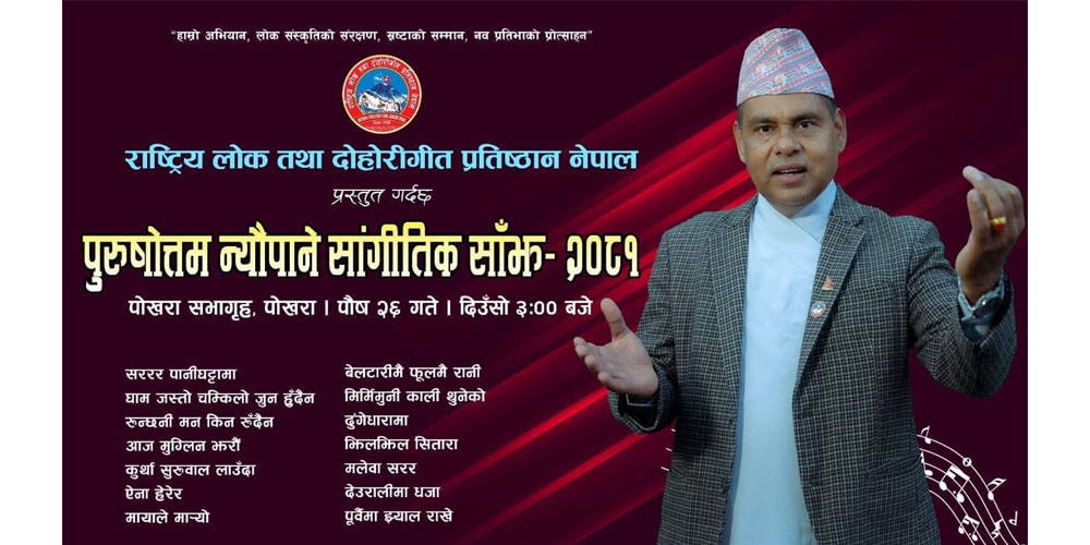 पोखरामा पुरुषोत्तम न्यौपाने सांगीतिक साँझ हुने भएको छ । राष्ट्रिय लोक तथा दोहोरी गीत प्रतिष्ठानले आगामी पुस २६ गते पोखरा सभागृहमा उक्त कार्यक्रम गर्न लागेको हो ।